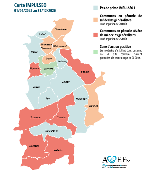 Pour savoir quel est le degré de pénurie de la commune dans laquelle vous comptez vous installer, référez-vous à la carte IMPULSEO à droite de ce texte. Attention, la commune de Verviers est considérée comme une zone d’action positive. Les médecins s’installant dans certaines rues de cette commune peuvent prétendre à la prime d’impulsion de 20 000€. La liste des rues est reprise sur le site de l’AViQ.